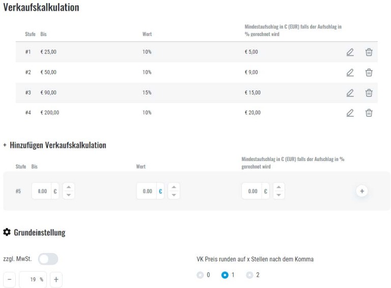 Die Verkaufskalkulation ermöglicht Ihnen Ihre eigenen Verkaufspreise auf Basis einer Aufschlagskalkulation im Shop zu hinterlegen. Die Verkaufspreise werden dabei durch einen festzulegenden Aufschlag auf Ihre Einkaufspreise bei uns ermittelt. Die Aufschläge können wahlweise in Prozent (%) oder in Euro (€) hinterlegt werden. Um den unterschiedlichen Wertigkeiten der Produkte gerecht werden zu können, stehen Ihnen insgesamt 5 Stufen zur Verfügung. Es können also maximal 5 Einkaufspreisstufen festgelegt werden, die dann jeweils mit einem individuellen Aufschlag belegt werden können. Wenn Sie %-Aufschläge nutzen, können Sie zusätzlich pro Stufen einen Mindestaufschlag in Euro kalkulieren, z.B. bei niedrigpreisigen Zubehörartikeln. Zur Verdeutlichung finden Sie nachfolgend ein Kalkulationsbeispiel mit %-Aufschlag und Bruttobasis:
